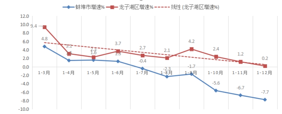 1-12月,GDP完成188.6亿元,居全市第7位;增长3.3%,低于全市平均增速2.2个百分点,居全市第9位;低于全省平均增速2.2个百分点;较上年同期提高0.7个百分点,后移1位。