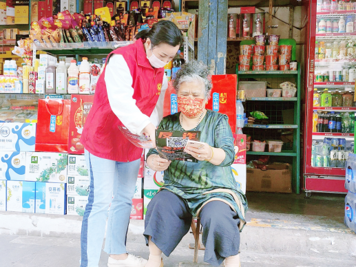 志愿者向门店商家摸排反诈线索,宣传反诈知识