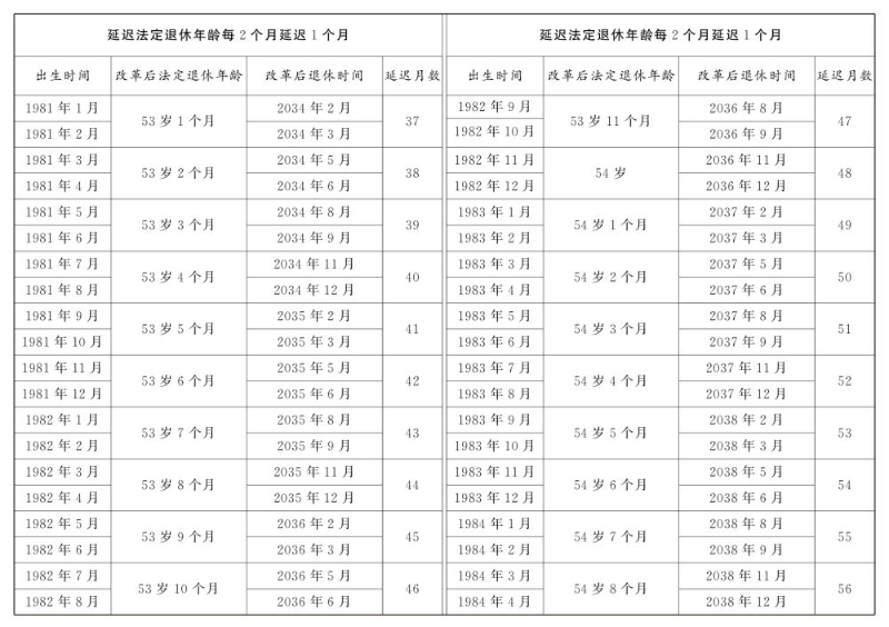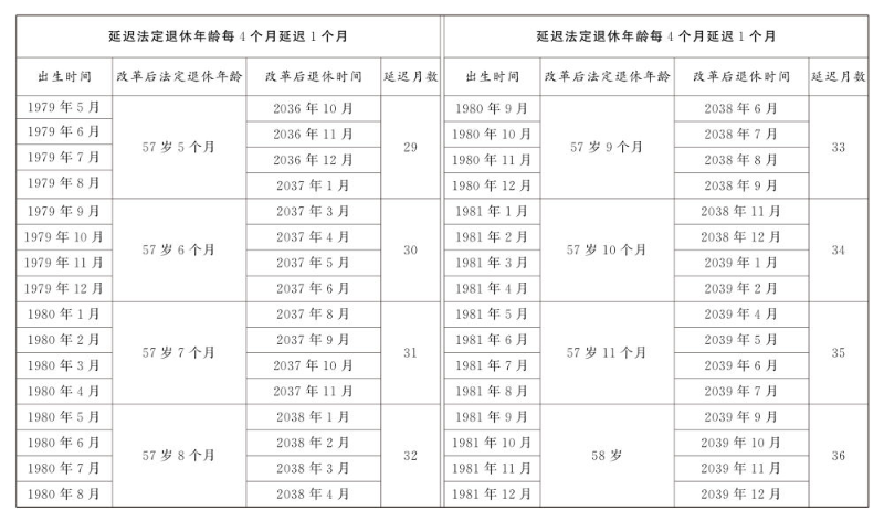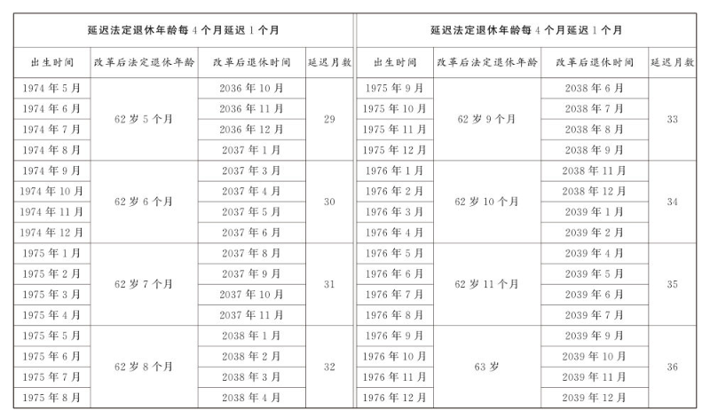 第一条 从2025年1月1日起,男职工和原法定退休年龄为五十五周岁的女职工,法定退休年龄每四个月延迟一个月,分别逐步延迟至六十三周岁和五十八周岁;原法定退休年龄为五十周岁的女职工,法定退休年龄每二个月延迟一个月,逐步延迟至五十五周岁。国家另有规定的,从其规定。