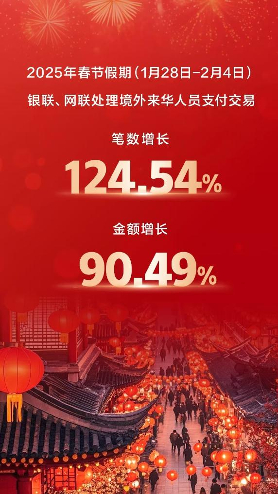 中国人民银行最新发布的数据显示,蛇年春节假期(1月28日至2月4日),银联、网联共处理境外来华人员支付交易笔数较去年春节假期增长124.54%,交易金额增长90.49%。