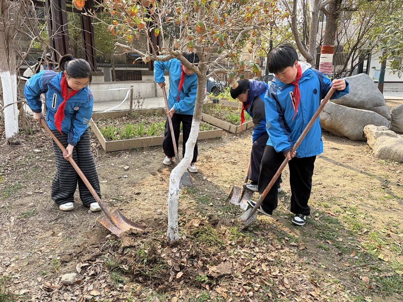 3月12日上午,同学们化身小小志愿者,手持铁锹、提着水桶,为校园小树苗松土、浇水,细心呵护新绿;还来到校园小菜园浇水打理,以劳动践行志愿精神。