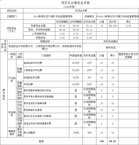 专项业务费项目绩效自评综述:根据年初设定的绩效目标,项目绩效自评得分为100分。全年预算数为58万元,执行数为51.11万元,完成预算的98.81%。项目绩效目标完成情况:预算编制科学,管理执行到位,预算资金在产出、效益和满意度绩效指标方面均取得较好的执行效果,各项经费得到了有效控制,项目支出管理规范性整体较好。发现的主要问题及原因:绩效目标设置比较简单,指标体系设置不够精细。下一步改进措施:一是建议社会效益指标设置细化量化;二是加强统筹协调。