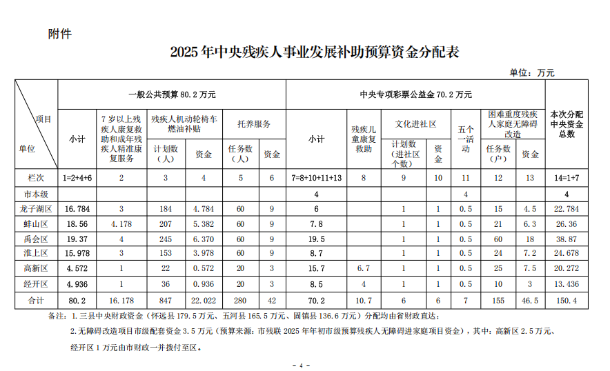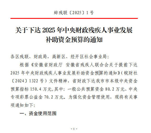 蚌埠市残疾人联合会关于下达2025年中央财政残疾人事业发展补助资金预算的通知