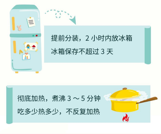 (2)熟食室温放置后再食用,要二次加热;从冰箱里取出的生冷熟食,特别是剩饭剩菜,也不能直接食用,一定要彻底加热。