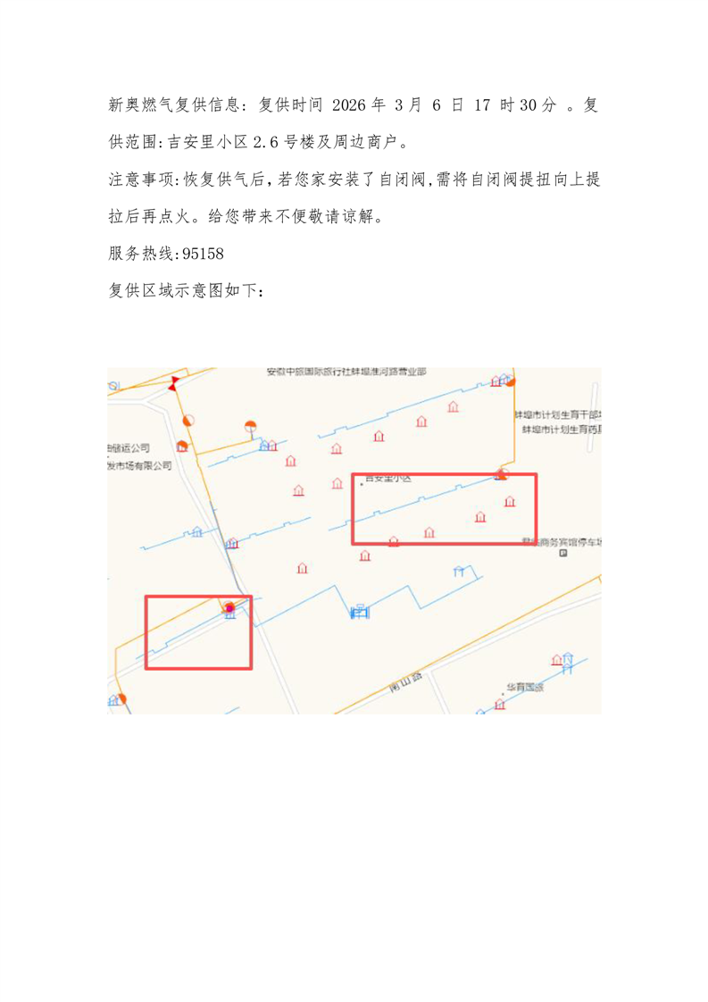 新奥燃气复供信息 复供时间 2026年 3月 6 日 17 时30分 。复供范围:吉安里小区2.6号楼及周边商户。