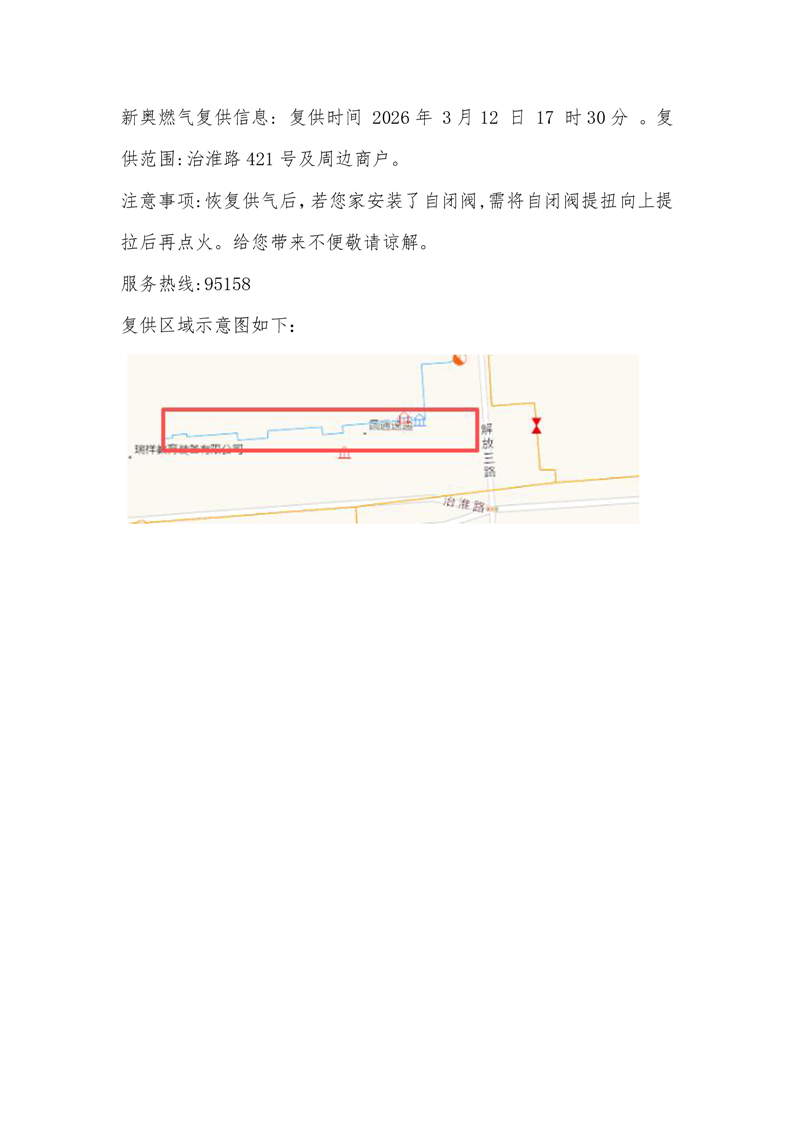 新奥燃气复供信息 复供时间 2026年 3月12 日 17 时30分 。复供范围治淮路421号及周边商户。