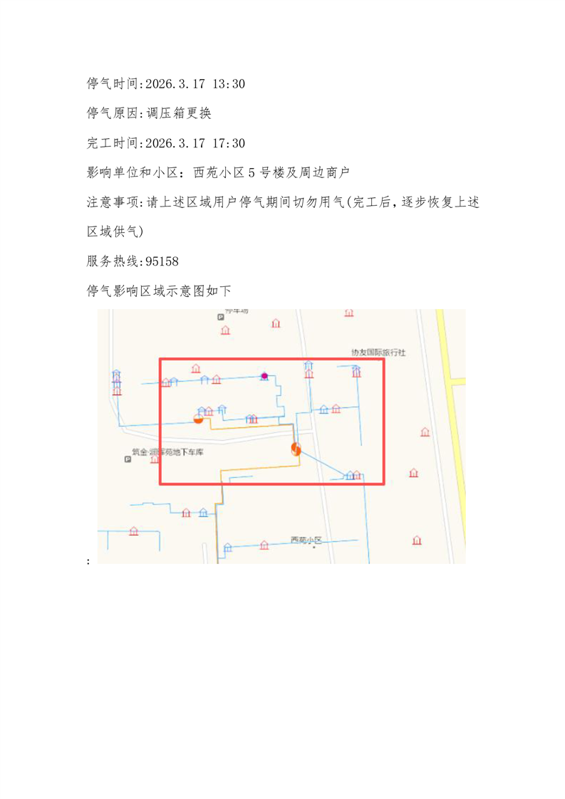 蚌埠新奥燃气停气通知:因调压箱更换,计划2026年3月17日13时30分-17时30分期间停气。停气范围:西苑小区5号楼及周边商户。